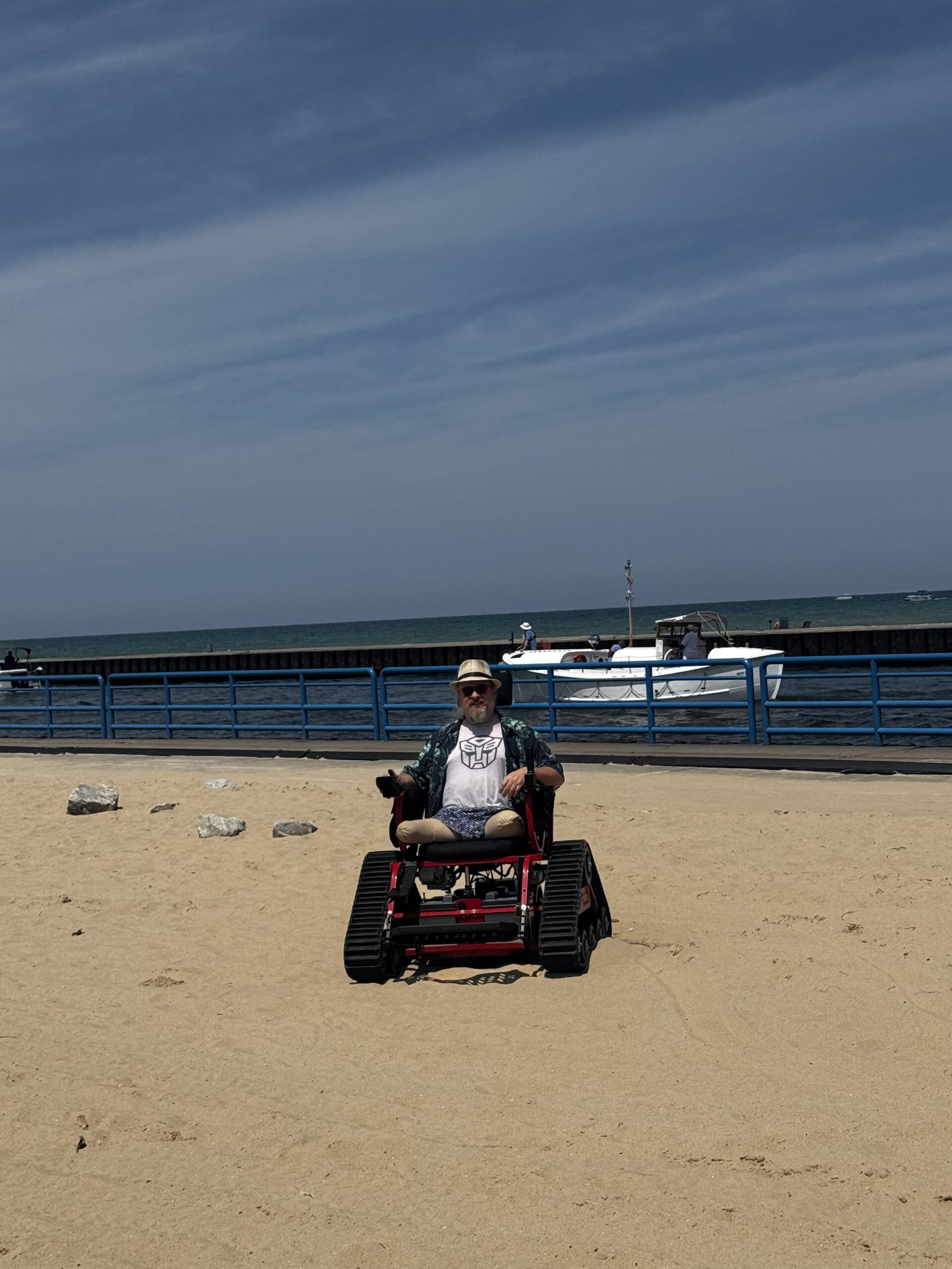 Now, last summer I experienced a Track Chair for the first time while at the beach in South Haven, Michigan. It allowed me to go wherever I wanted on the beach, without needing to rely on a family member to push a beach wheelchair with big inflatable wheels and no personal control. However, while it was easy to transfer to from my wheelchair, it was difficult to get out of (if I wanted to get down on the sand or go in the water) and it had to be recharged every two hours…which would take about 45 minutes.